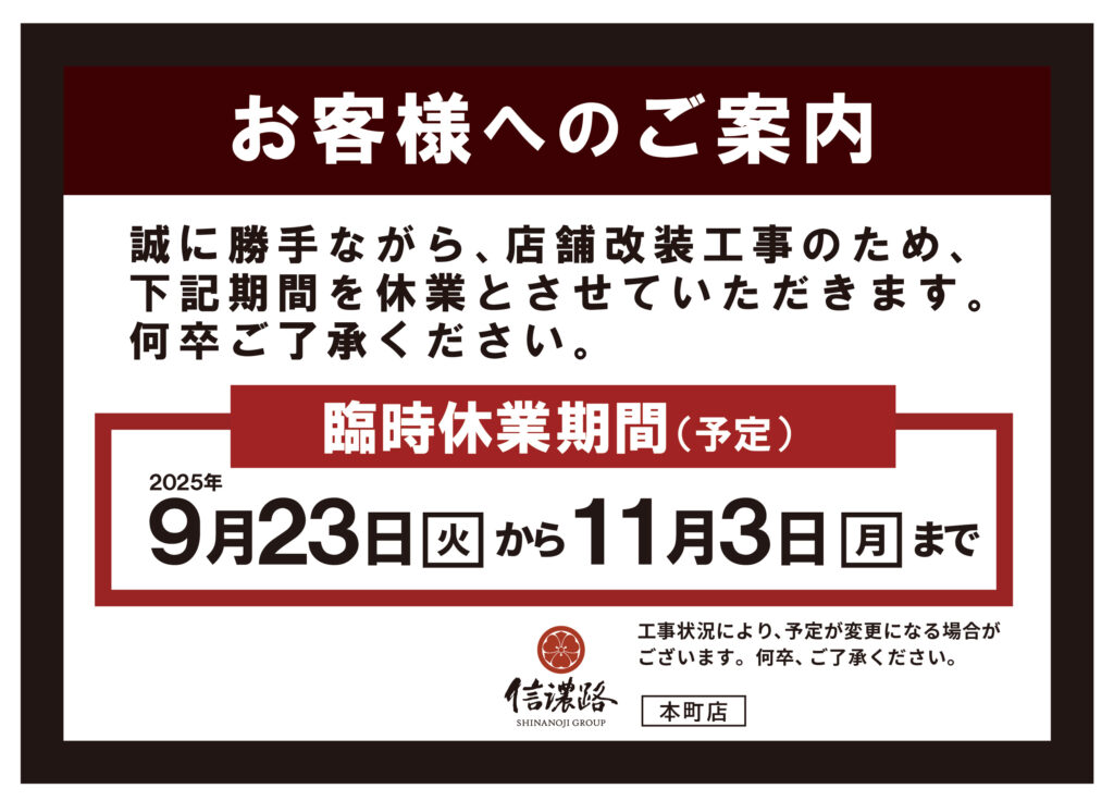 “信濃路 本町店”を下記の期間、臨時休業いたします。