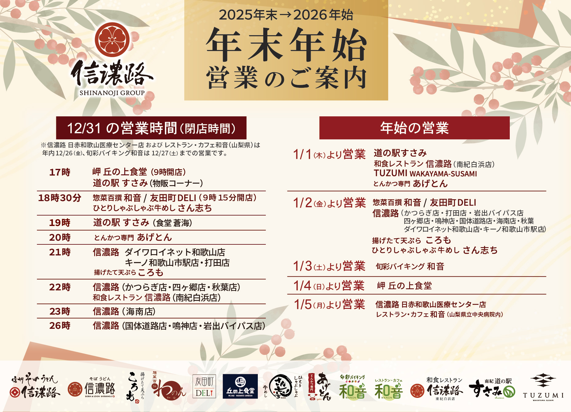 信濃路 ダイワロイネット和歌山店 所在地 〒640-8156 和歌山県和歌山市七番丁26-1 ダイワロイネットホテル和歌山1F 【2025.11/1(土)リニューアルOPEN】 電話番号 073-427-2652 営業時間 11:00~21:00(ラストオーダー20:30) ※その日の営業状況により閉店時間より早い時間で閉店させて頂く場合がございます。 アクセス 車で行く / 電車で行く 詳しく見る 予約する