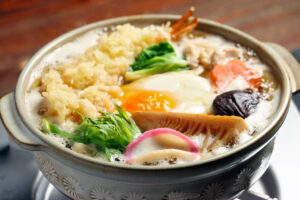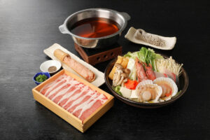 お肉:鹿児島産黒豚・自家製鶏ミンチ、野菜:白菜・水菜・京ネギ・えのき・しめじ・豆腐・人参、海鮮:海老・かんぱち・はまぐり、その他:お蕎麦