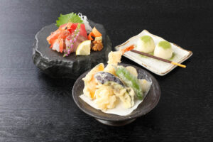 前菜5種盛・お造り5種盛・熊野牛陶板焼き・揚げ物・季節の釜めし・〆蕎麦・甘味
