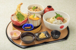 梅しらすそば/天盛/あんかけ出汁巻き/小鉢/かやくご飯/お漬物